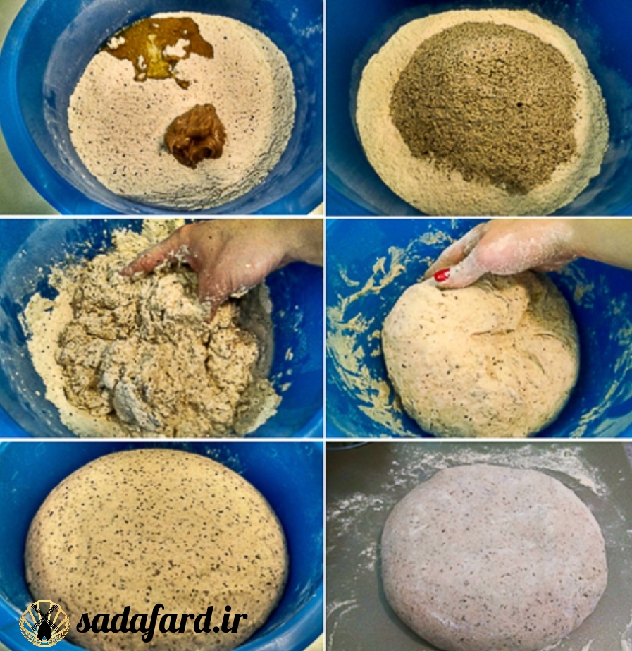 خمیر را آنقدر ورز دهید تا مواد کاملاً با هم ترکیب شوند و یک خمیر سفت و یکدست به دست آید. سپس روی خمیر را بپوشانید و به مدت ۳۰ دقیقه در جای گرمی قرار دهید تا حجمش دو برابر شود.
