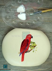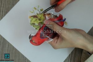 دور الگوی مورد نظر را با قیچی میبریم. (اگر بخواهیم کار راحتتر شود، اول میتوانیم دور الگو را ببریم و بعد آن را داخل آب قرار دهیم تا از کاغذش جدا شود.)