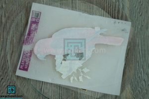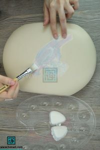 به آرامی روی قسمتهای مختلف طرح را چسب میزنیم. (پس از این که چسب کاملاً خشک شد، دیگر دیده نمیشود و شفاف میشود.)