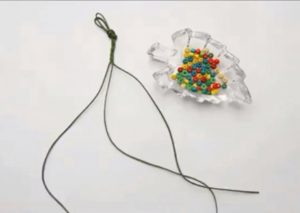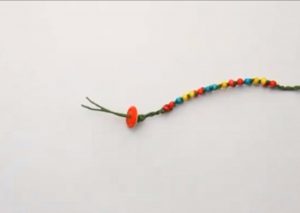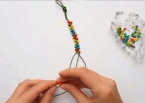 بعد از چند دور بافتن، چند مهره چوبی به نخها اضافه کنید و کار بافتنتان را ادامه دهید تا به اندازه مورد نظرتان برسید.