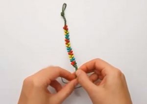 انتهای رشتهها را به هم گره بزنید، سپس دوباره چند بافت ساده بدون استفاده از مهره انجام دهید.