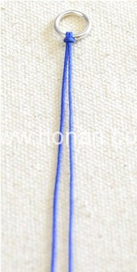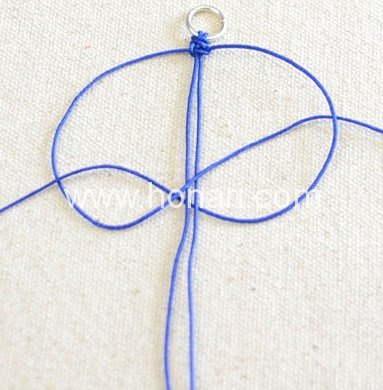 ابتدا، یک نخ آبی پررنگ به طول ۳۵ سانتیمتر برش بزنید. سپس، مطابق شکل، یک گره روی حلقه اتصال بزنید.