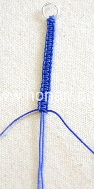وقتی بافت شما به اندازه ۶.۵ سانتیمتر رسید، حالا چهار رشته نخ مکرومه را بردارید و از داخل یکی از سوراخهای بست عبور دهید. سپس تمام این چهار رشته را به سمت عقب تا بزنید.