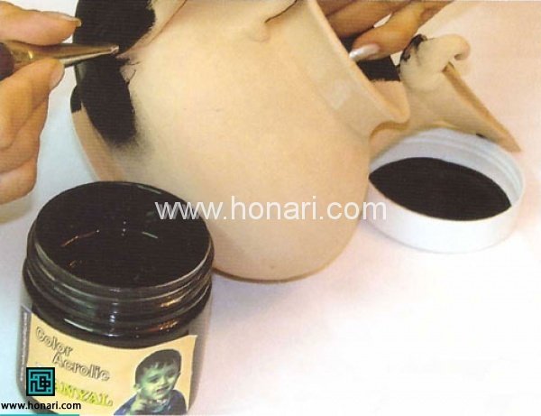 در مرحله اول، یک لایه یکدست و کامل از رنگ مشکی را بر روی سطح سفال میکشیم.