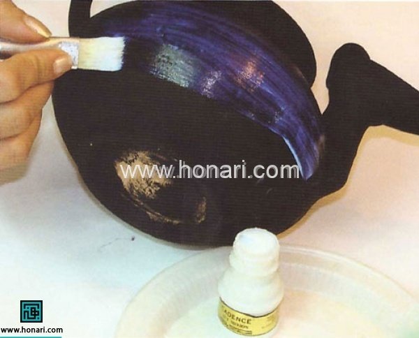 در مرحله دوم، چسب مخصوص ورق طلا را با یک قلمو روی قسمتی که میخواهیم طلاکاری کنیم، میزنیم. سپس صبر میکنیم تا این چسب کاملاً بیرنگ و شفاف شود.