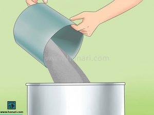 ابتدا یک لیوان پودر سیمان سفید را با سه لیوان پودر خاک سنگ ترکیب میکنیم. سپس این مخلوط را از یک صافی عبور میدهیم تا یک پودر نرم و کاملاً یکدست به دست آید.