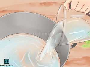 مقداری از آن را در یک کاسه بریزید. سپس به آرامی و کمکم به آن آب اضافه کنید و هم بزنید تا کاملاً با هم مخلوط شوند و یک خمیر یکدست به دست آید. این خمیر باید غلظتی مانند ماست داشته باشد؛ نه زیاد سفت و نه زیاد شل.