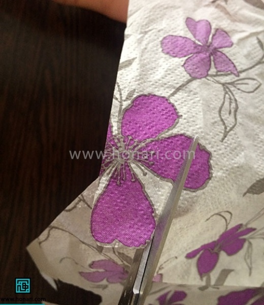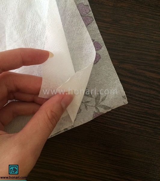 توجه داشته باشید که اگر به جای دستمال از کاغذ مخصوص دکوپاژ استفاده میکنید، این مرحله لازم نیست چون کاغذ دکوپاژ فقط یک لایه دارد.