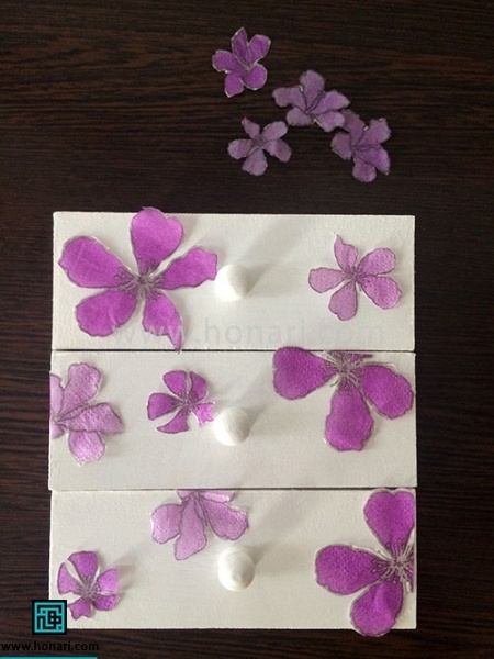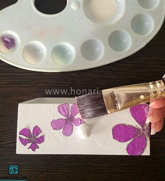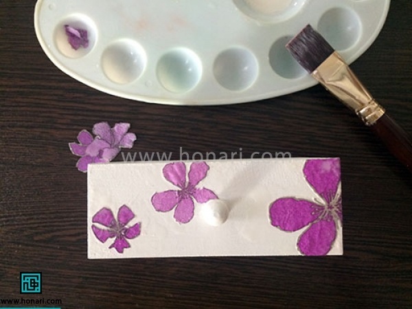 مقداری چسب مخصوص کارهای دستمال کاغذی داخل ظرف رنگ بریزید. سپس به آرامی و با کمک یک قلمو، این چسب را روی گلها بمالید.