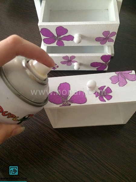 در مرحله پایانی برای نگهداری از اثر هنری، از یک اسپری محافظ استفاده میکنیم. این اسپری را از فاصله تقریباً سی سانتیمتری به آرامی روی تمام قسمتهای کار میپاشیم.