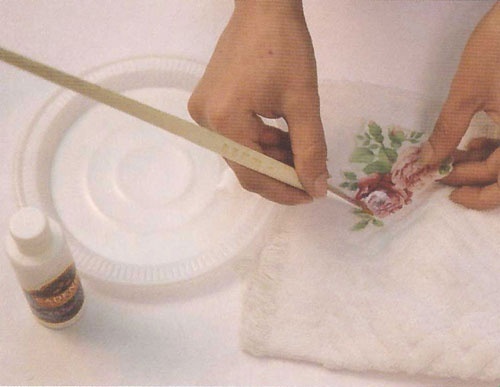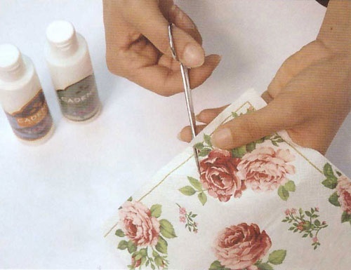 تصویر مورد نظر را با دقت از روی دستمال کاغذی یا کاغذ مخصوص دکوپاژ جدا کرده و قیچی میکنیم.