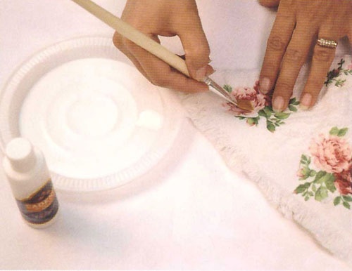 برای تزئین حوله، از یک چسب مخصوص استفاده میکنیم که برای چسباندن دستمال کاغذی به پارچه طراحی شده است. با این چسب، دستمال را به راحتی و با دقت روی حوله ثابت میکنیم.