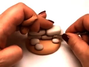با استفاده از خمیر کرم و مشکی و ابزارهای فیمو، اجزای صورت عروسک مانند چشمها، بینی، گوشها و دهان را درست کنید. همچنین از خمیر کرم برای ساختن دستهای عروسک استفاده نمایید. با کمک یک تیغ میتوانید شکل انگشتهای دست را ایجاد کنید.