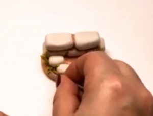 با خمیر سبزی که آماده کردهاید، نوارهای باریک و کوچکی درست کنید. سپس این نوارها را دور سنگها بپیچید تا شکل سبزه را به خود بگیرند. در پایان، با استفاده از یک وسیله مناسب، دو سر خمیرها را به خوبی به سنگ بچسبانید و محکم کنید.