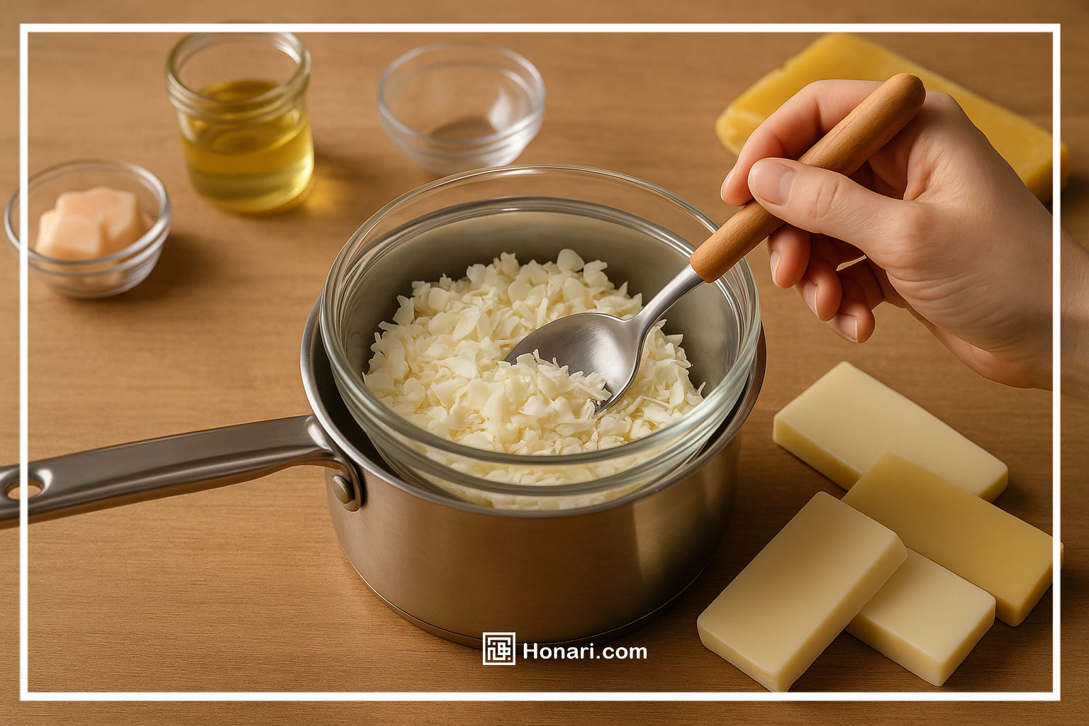 ذوب کردن موم: مومها را به روش حرارت غیرمستقیم (بنماری) یا با استفاده از مایکروویو آب کنید. دقت کنید دمای موم به حدود ۸۵ درجه سانتیگراد برسد.