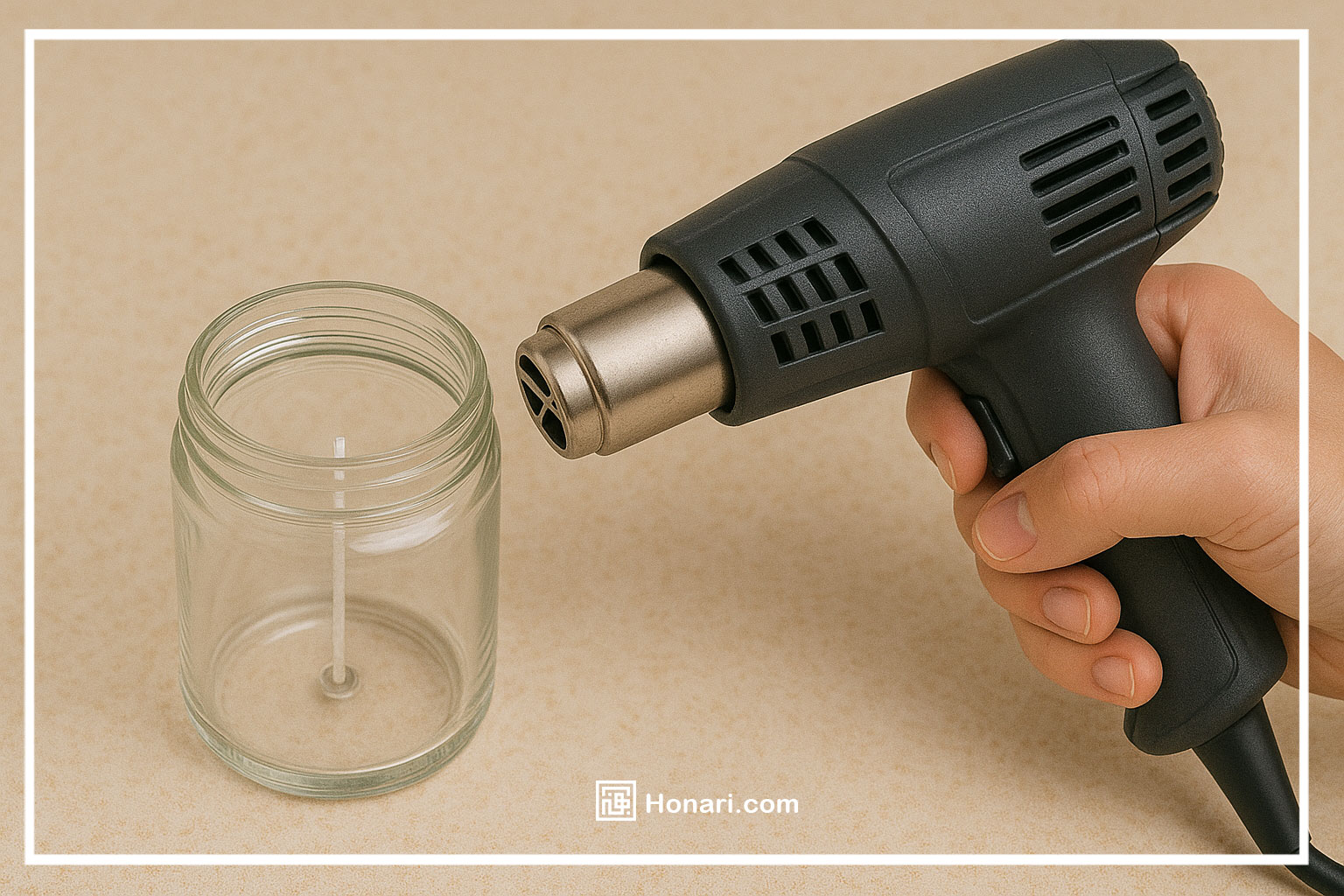 یک نکته مهم: قبل از ریختن پارافین در ظرف شیشهای، آن را با سشوار گرم کنید تا بین شمع و دیوارهی ظرف فاصله یا حباب ایجاد نشود.