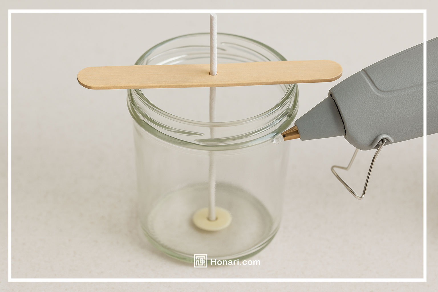 ظرف را کاملاً تمیز بشویید و آب آن را بگیرید تا خشک شود. سپس فیتیله را با کمک چسب به وسط ظرف بچسبانید. برای این که فیتیله صاف و راست بایستد، میتوانید از یک چوب بستنی یا گیره لباس کمک بگیرید تا آن را در حالت عمودی نگه دارید.