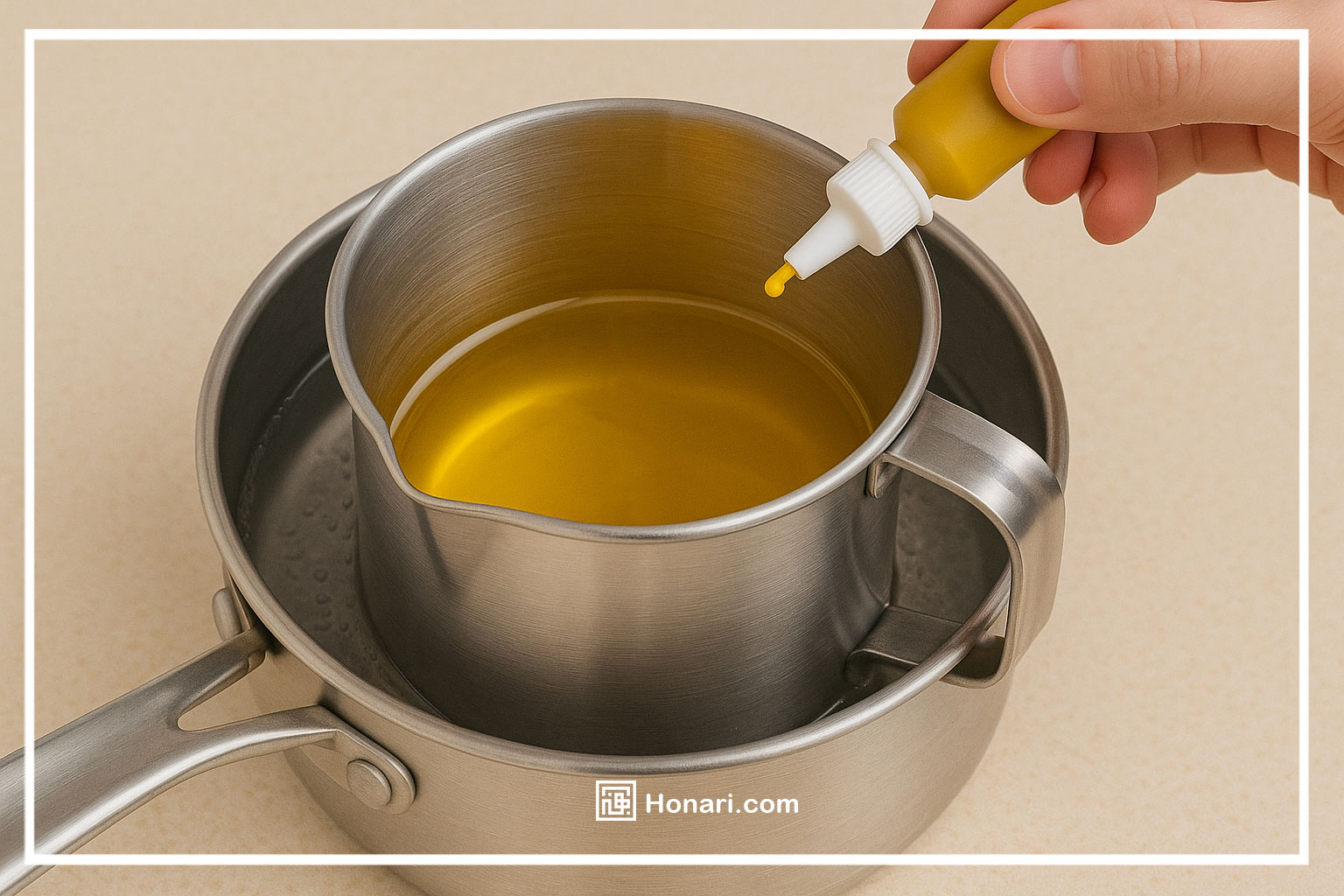 بعد از اینکه موم پارافین ذوب شد، میتوانید چند قطره عطر و رنگ مخصوص شمع به آن اضافه کنید. سپس آن را هم بزنید تا همه مواد کاملاً با هم مخلوط شوند.