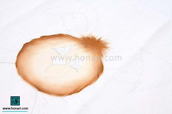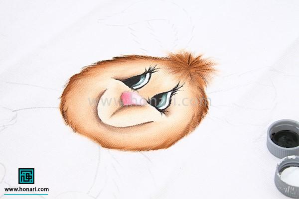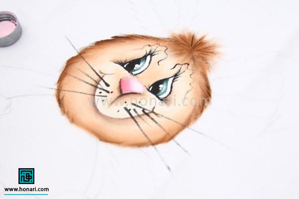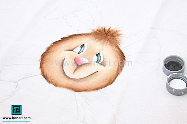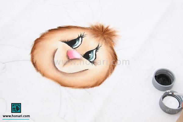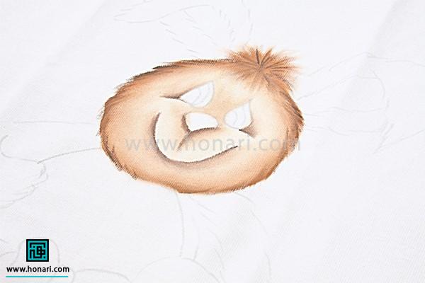 برای طراحی روی حوله با قهوهای روشن، دور چشم و بینی را سایه میزنیم تا نقاشی از حالت مسطح و ساده خارج شود.