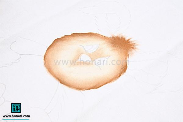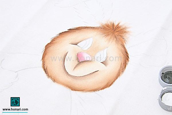 با حرکتهای نرم و آرام قلم مو، دور صورت را طوری رنگ میزنیم که حالت موهای خرگوش نشان داده شود.