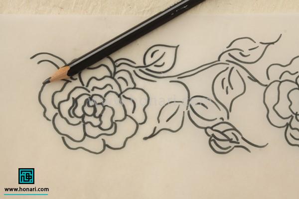 برای شروع، نقشه طرح را روی یک کاغذ نازک مخصوص رسم میکشیم. سپس با یک مداد و کاغذ کاربن، طرح گل را با دقت روی پارچه پیاده میکنیم.