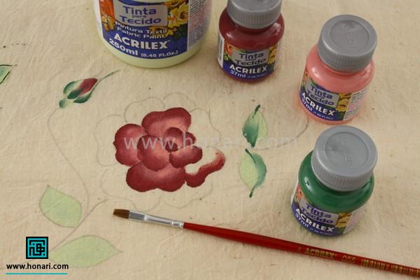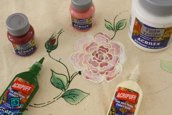 در مرحله بعدی از نقاشی روی پارچه، با استفاده از رنگ عاجی، به آرامی و با دقت خطوط مربوط به گلبرگهای گل را رنگآمیزی میکنیم.