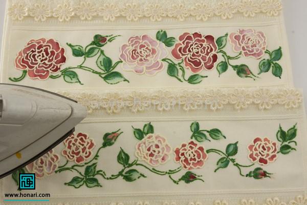 کار را به مدت یک روز کنار میگذاریم تا استراحت کند. سپس یک اتوی داغ را در فاصله حدود دو تا سه سانتیمتری از کار نگه میداریم تا رنگها کاملاً خشک شوند.