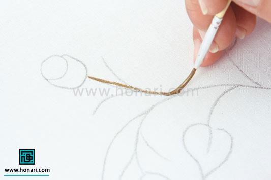 پیش از آنکه مستقیماً روی پارچه نقاشی را شروع کنیم، ابتدا طرح مورد نظر را روی کاغذ شفاف (کاغذ کالک) میکشیم.