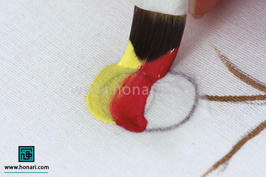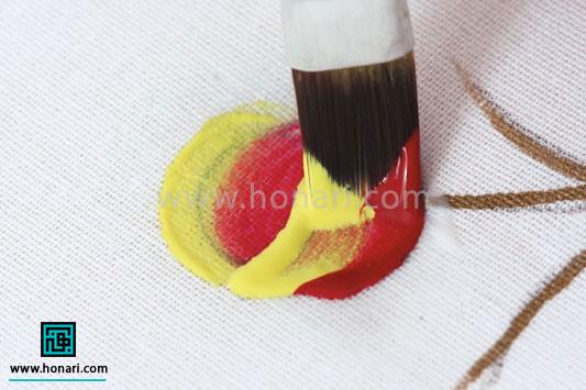 سپس، دو طرف قلم موی شماره ۱۲ را به دو رنگ زرد روشن و شرابی آغشته کنید