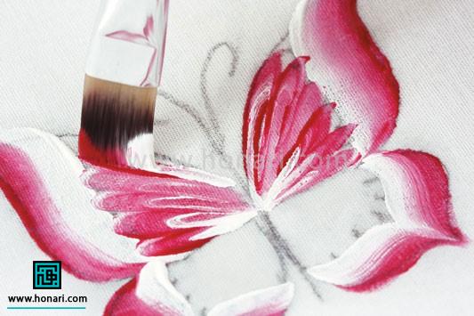 حالا نوبت به رنگآمیزی داخل بالها میرسد. از همان قلم و رنگهای قبلی استفاده میکنیم و از قسمت بدن پروانه شروع کرده، به آرامی به سمت لبه بیرونی بال حرکت میکنیم.