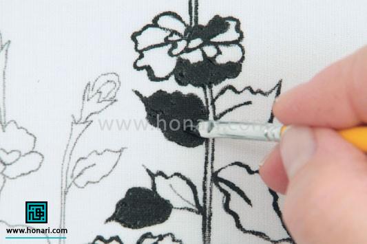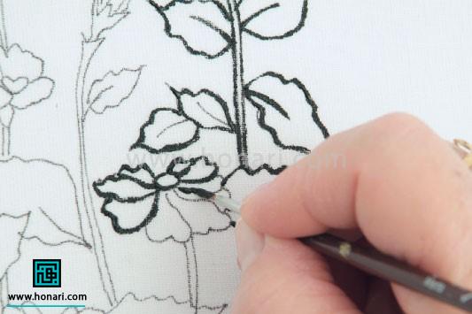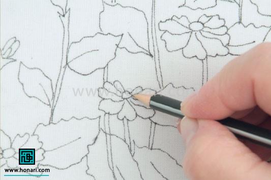 حالا با یک مداد، روی خطوط طرح میکشیم تا نقش آن به پارچه منتقل شود.