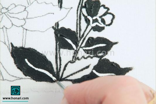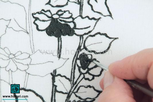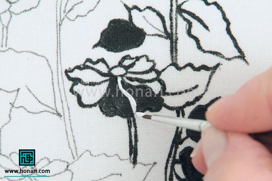 با استفاده از یک قلم موی نازک، خطوط طرح را با دقت روی پارچه رنگ میزنیم.