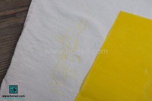بعد از اینکه طرح را روی پارچه منتقل کردید، نوبت به رنگآمیزی میرسد. ابتدا از رنگ زرد استفاده کنید. این رنگ را فقط روی قسمتهایی از طرح بزنید که قرار است روشن و شفاف دیده شوند.