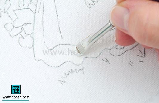 آموزش نقاشی روی پارچه، مثل همیشه با انتقال نقشه طرح آغاز میشود. ابتدا طرح مورد نظر را روی کاغذ کالک میکشیم. سپس پارچه را روی صفحه کار ثابت میکنیم.