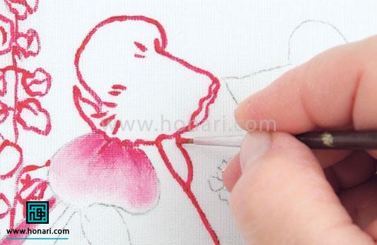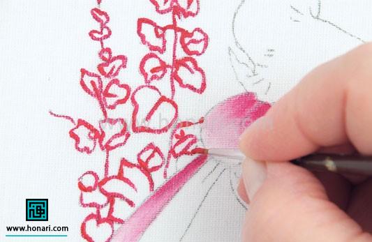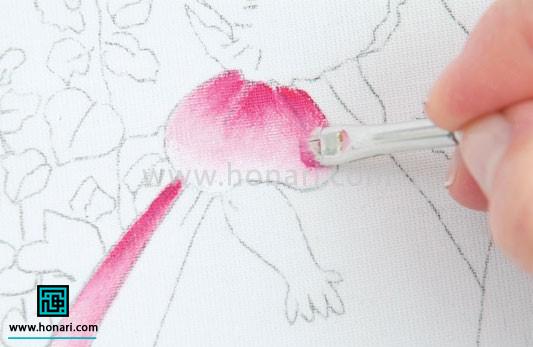 برای مرحله بعدی نقاشی روی پارچه، از یک قلم موی نازک شماره صفر و رنگ صورتی روشن استفاده میکنیم. با این قلم مو، به آرامی تمام خطوط دور هر گل را رنگ میزنیم و دقت میکنیم که همهی خطها به خوبی پوشانده شوند.