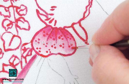 برای تکمیل نقاشی روی پارچهمان، نوار لباس را هم با قلم موی نازک شماره صفر و رنگ صورتی روشن، رنگ میزنیم.