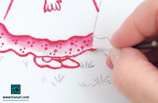 در این مرحله، مانند آموزش قبلیِ نقاشی روی پارچه، طرحهای روی کلاه دختر را با کمک قلم موی نازک شماره صفر و رنگ صورتی روشن، رنگآمیزی میکنیم.