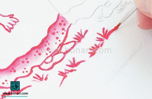 در پایان، با همان قلم موی نازک (سایز صفر) و رنگ صورتی روشن، خطوط علفها را به دقت کامل رنگآمیزی میکنیم.