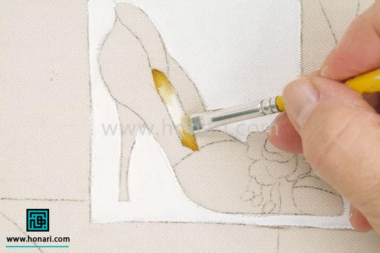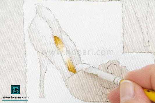 با یک قلم موی شماره ۶ و کمی رنگ سفید، کفش را با حرکت دادن قلم مو به صورت بالا و پایین رنگ میزنیم.