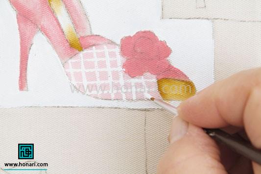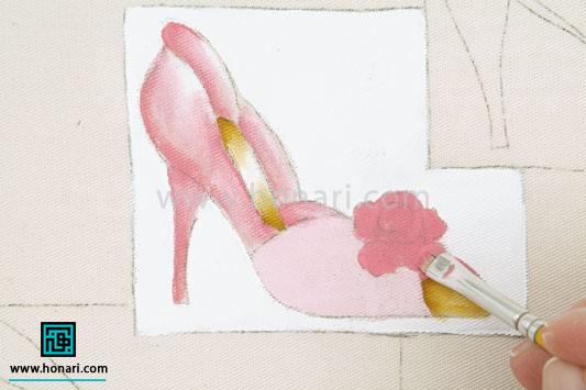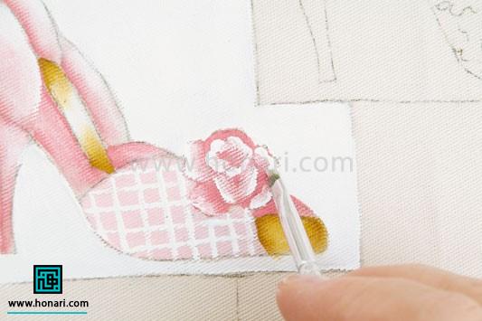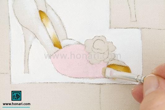 در مرحله بعدی از طراحی روی پارچه، با استفاده از رنگ صورتی روشن و یک قلم موی شماره ۶، لبههای بیرونی نوار روی کفش را رنگ میزنیم.