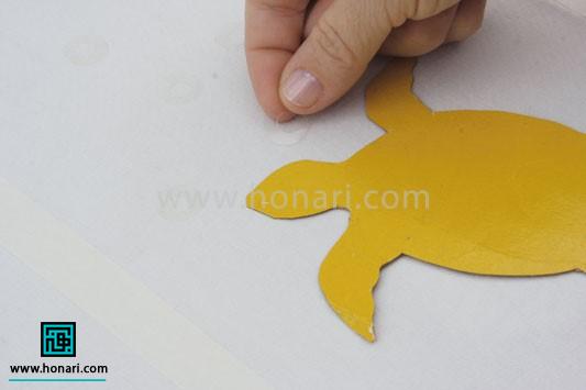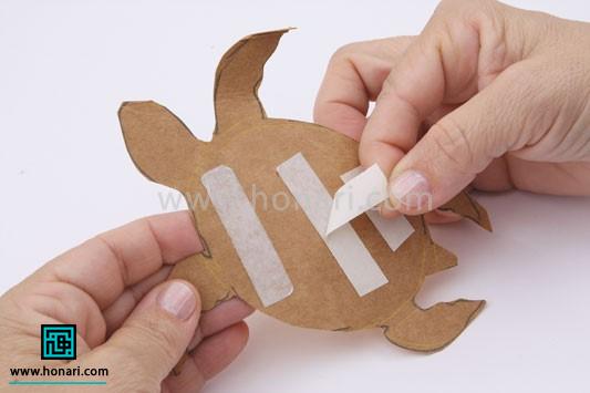 در پایان، با احتیاط نوارهای کاغذی، الگوی لاک پشت و برچسبها را از روی کار جدا میکنیم.