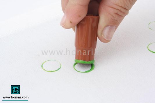 برای زیباتر شدن کار، با یک ماژیک و استفاده از ترکیب رنگی که در مرحله هشتم آماده کردیم، روی قسمت چپ پارچه، به شکل مُهری برای درست کردن طرح حباب، علامت میگذاریم.