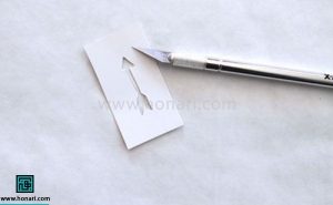 طرحی را که میخواهیم روی طلق پیاده کنیم، با دقت میکشیم و سپس با استفاده از یک تیغ، آن را برش میزنیم.