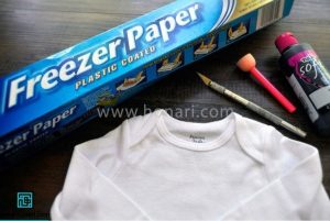 سپس این قالب را محکم روی پارچه قرار میدهیم. با استفاده از یک اسفنج یا غلطک که آغشته به رنگ مخصوص پارچه شده است، رنگ را به آرامی روی قسمتهای خالی قالب میزنیم.