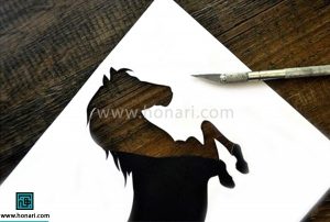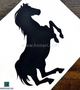 ابتدا طرح مورد نظر خود، که در اینجا یک اسب است، را روی یک کاغذ ضخیم یا مقوا پیاده میکنیم و با دقت آن را برش میدهیم تا قالب ما آماده شود.