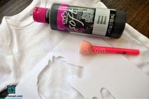 مرحله چهارم: حالا قالب استنسیل را در جایی که میخواهید طرح ایجاد شود، روی پارچه قرار دهید. سپس با کمک یک قلمو یا ابر و استفاده از رنگ مخصوص پارچه، درون طرح را به آرامی رنگآمیزی کنید.