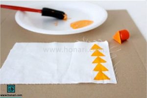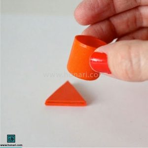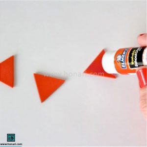 ابتدا شکل یک مثلث را روی مقوا رسم میکنیم. سپس آن را با قیچی میبریم و در پایان، روی آن چسب میزنیم.