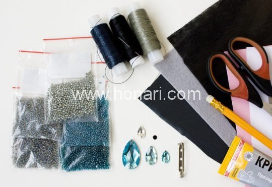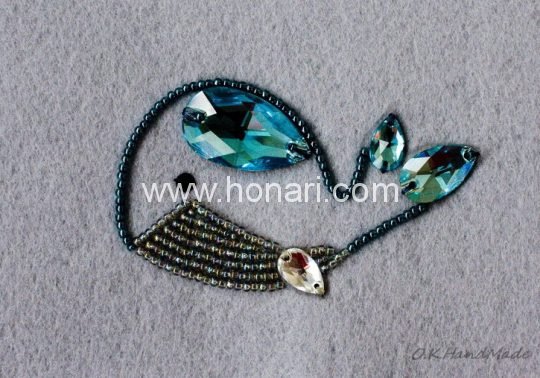 مهرههای آبی رنگ را به صورت پراکنده و بدون نظم خطی، کنار هم قرار دهید و بدوزید.
