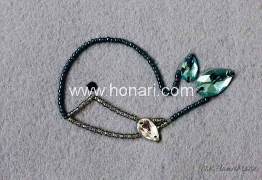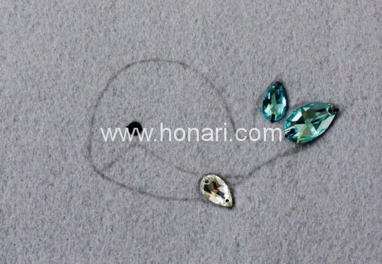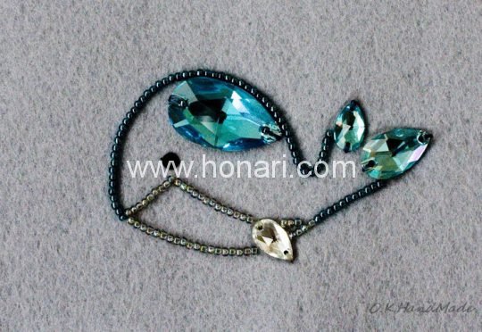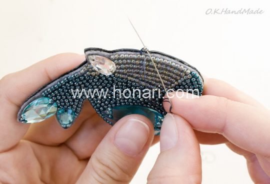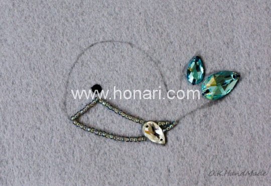 حالا، نگین درشت و شفاف را با کمک نخ خاکستری پررنگ، به بخش بالایی کمر نهنگ وصل کنید. سپس، داخل حفرههای نگین کریستالی را با دانههای ریز منجوق پر کرده و محکم بدوزید.
