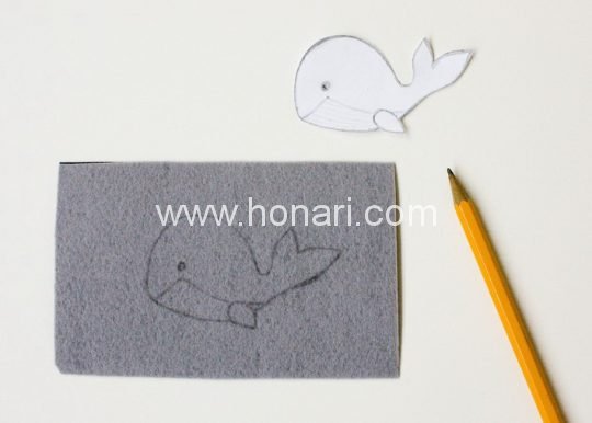 اول، یک تکه نمد به رنگ طوسی بردارید. بعد، الگوی نهنگ آبی که در این آموزش وجود دارد را روی کاغذ الگو بکشید.